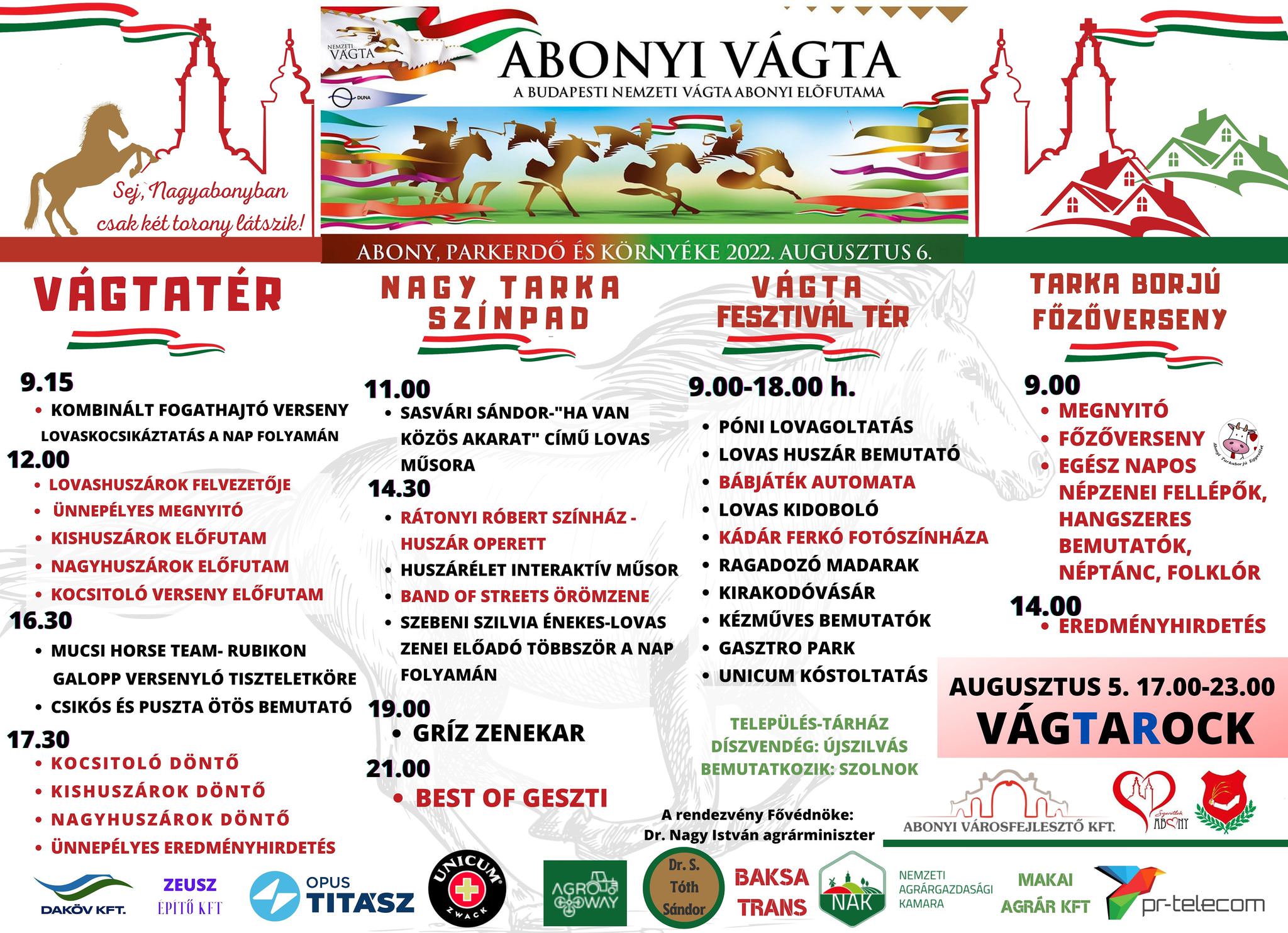 Az Abonyi Parkerdőben és a mellette lévő Vágta Téren rendezik meg az Abonyi Vágtát, amelyet már most nagy várakozás előz meg – a szervezők a versenyeket számos kísérőprogrammal igyekeztek színesíteni, melyek több helyszínen, színpadon zajlanak majd. A rendezvény fővédnöke Dr. Nagy István agrárminiszter. A rendezvényt az Abonyi Városfejlesztő Kft. szervezi. Az Abonyi Vágta egy „előestével” kezdődik meg augusztus 5-én a Parkerdőben. A VÁGTAROCK programon retro élő koncerteket láthat és hallhat a közönség.
